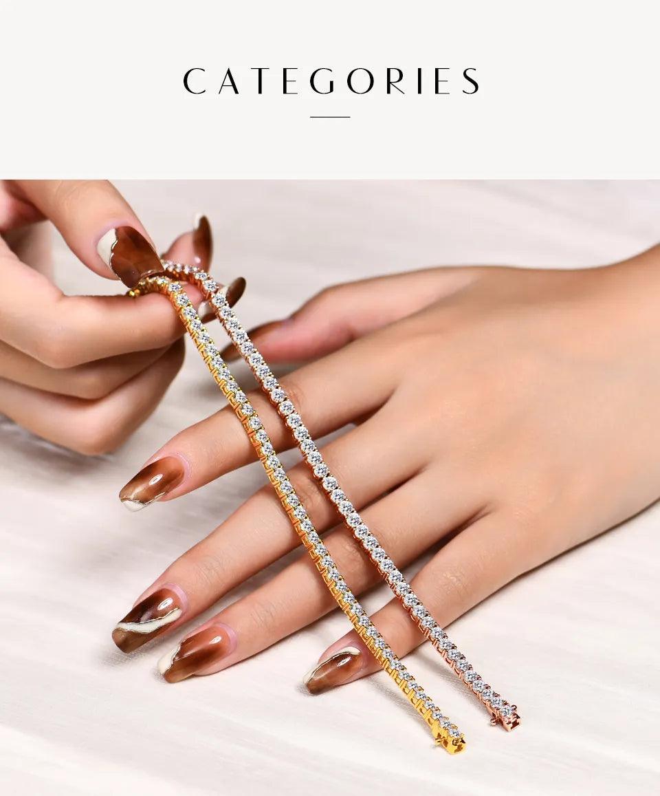 Experience the allure of this Tennis Bracelet adorned with exquisite Moissanite stones that rival the sparkle of diamonds. Its impeccable craftsmanship guarantees to captivate onlookers and elevate the elegance of any attire. No matter the occasion, this accessory is a must-have to radiate self-assurance and opulence.