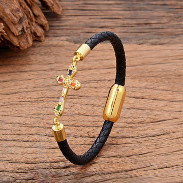 Trendy Classic Leather Rope Zircon Crystals Cross Bracelet Charming Bracelets - Christian Design Jewellery