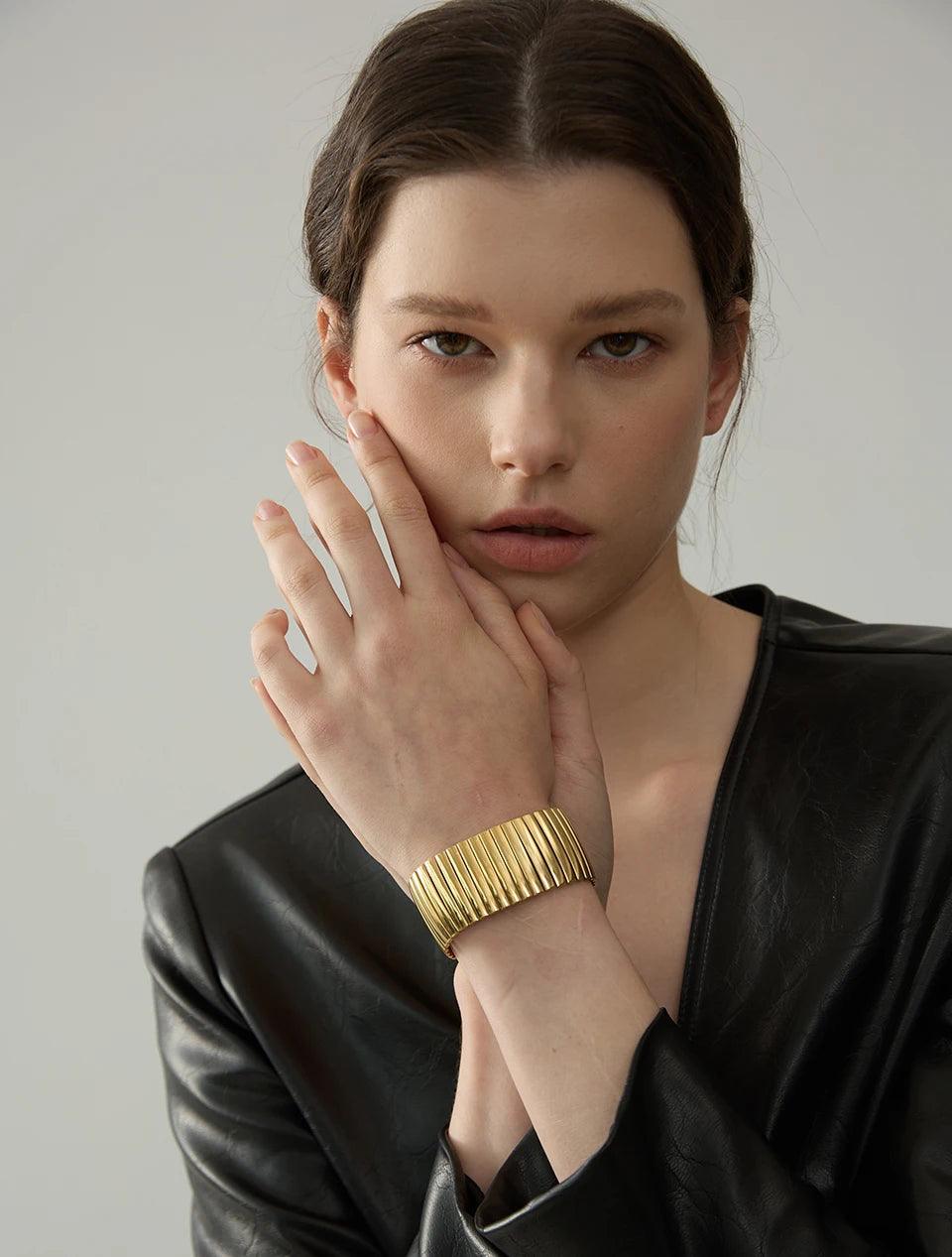 New Elastic Stainless Steel Metal Wide Big Statement Bracelet Bangle - 18K Gold Plated Hyperbole Unisex Jewellery