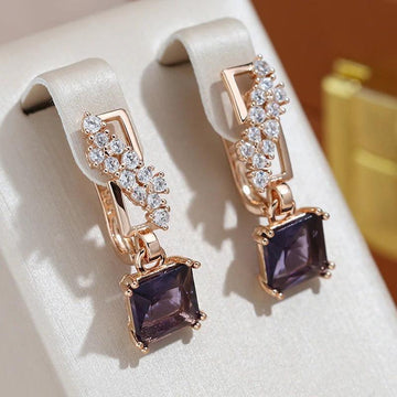 Luxury Large Square AAA Purple Zircon Crystals 14K Rolled Rose Gold Dangle Earrings - Vintage Style Jewellery