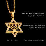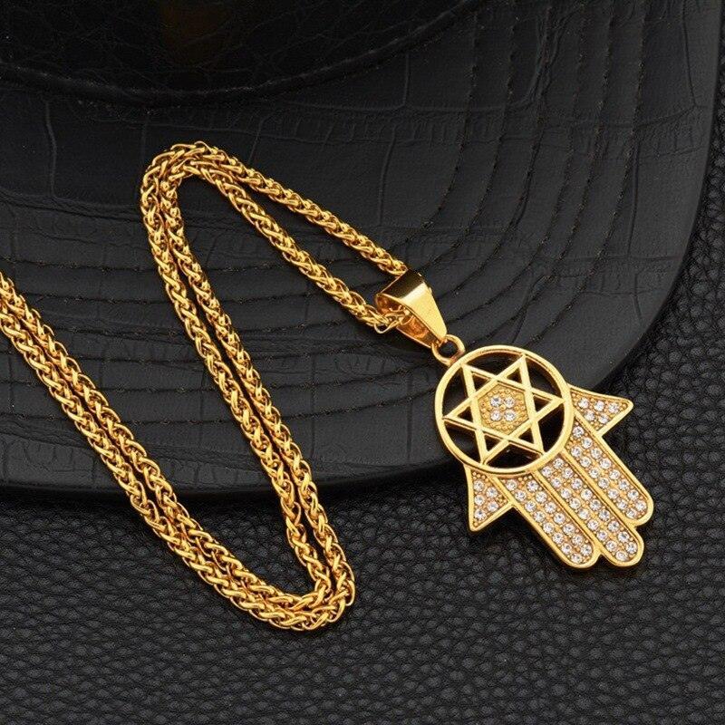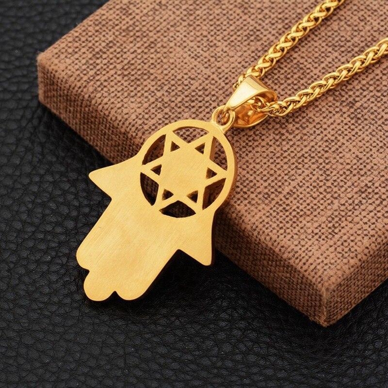 Jewish Star Of David Hasma Hand Of Fatima Pendant Necklaces Gold Color Stainless Steel Chains For Women and Men This product includes a beautiful combination of ancient symbols and modern design, making it the perfect addition to any wardrobe. Crafted in stainless steel with a durable gold color coating, it is sure to be a lasting accessory.