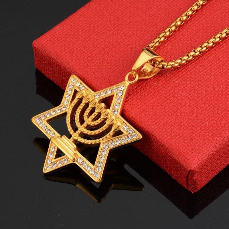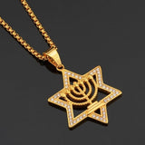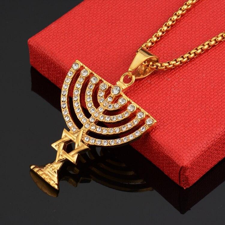Israel Menorah Happy Hanukkah Necklaces Golden Colour Stainless Steel Jewelry Star Of David Hexagram Pendant Shop online for Religious Jewelry products Find beautiful and classic religious jewelry in our exclusive religious line. Many people wear them to assert their faith and others like Fashion Accessories  SPECIFICATIONS Style: Religious Necklace PendantsPendant...