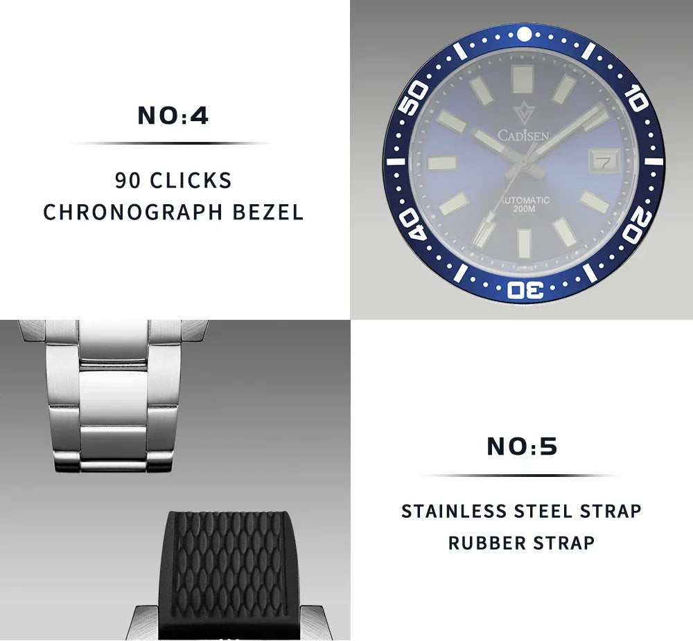- 90 Clicks Chronograph Bezel,12 o'clock Luminous Markers.