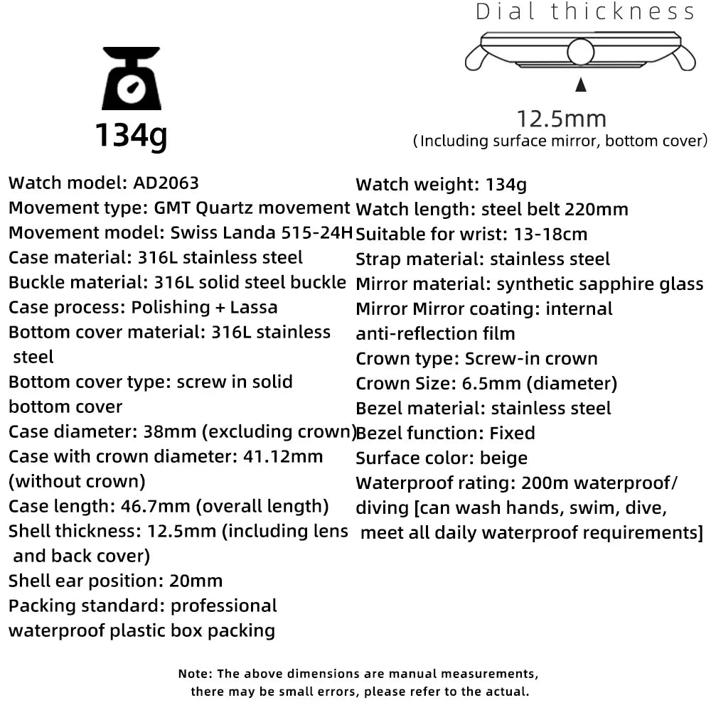 Introducing the NEW Luxury Brand 38mm Stainless Steel GMT Movement Sapphire Glass 20Bar Waterproof AD2063 Diver Quartz Watches. A sophisticated and stylish timepiece designed for the discerning gentleman. Take advantage of our ongoing sale on men's watches, allowing you to discover incredible discounts while upholding your fashion sense and high standards of quality. This is the perfect time to delve into fresh options and perhaps find your next favorite watch at an unbeatable price.