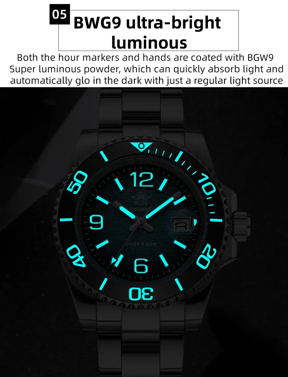 Luminous bezel: BGW9 Superluminova glows blue