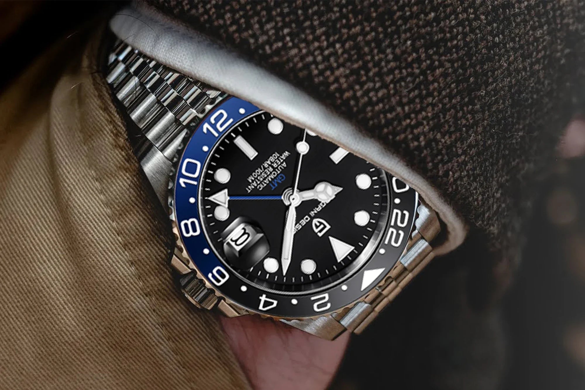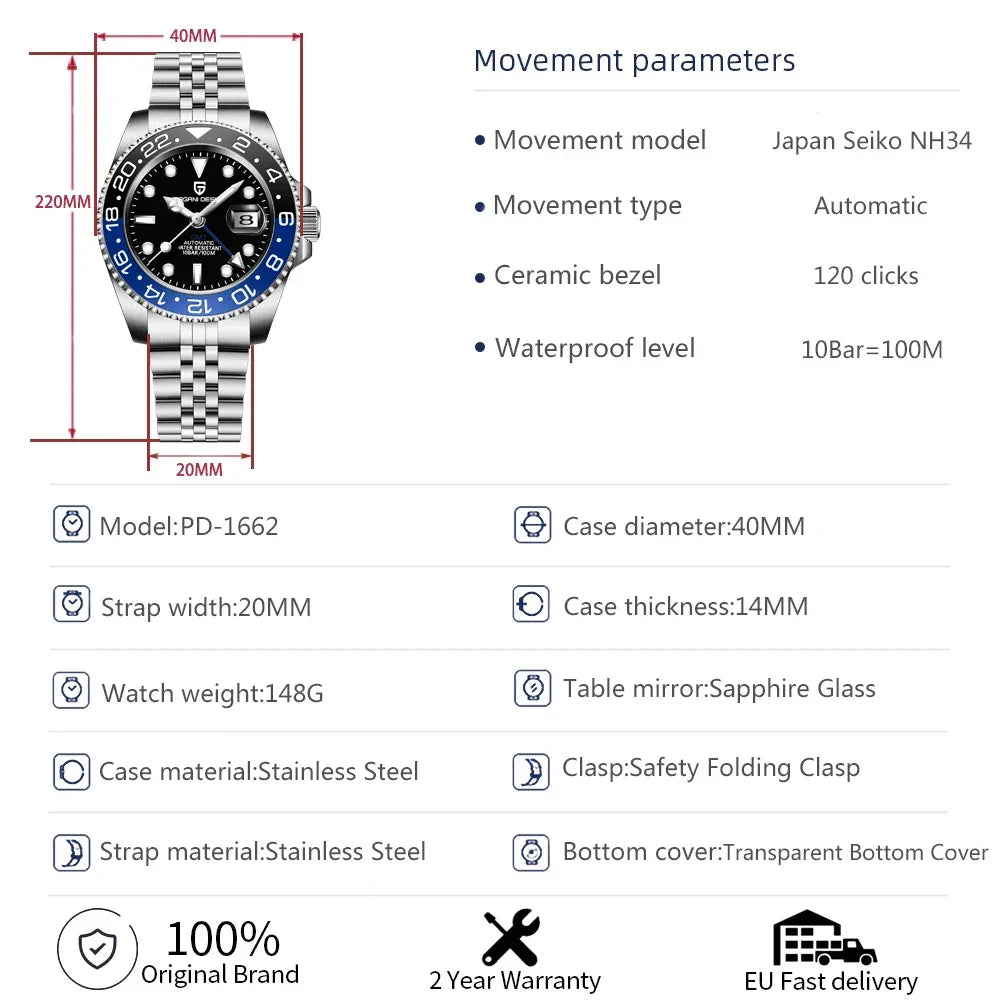TOP BRAND DESIGN 40MM GMT Luxury NH34 Automatic Stainless Steel Waterproof Men Mechanical Wristwatch
