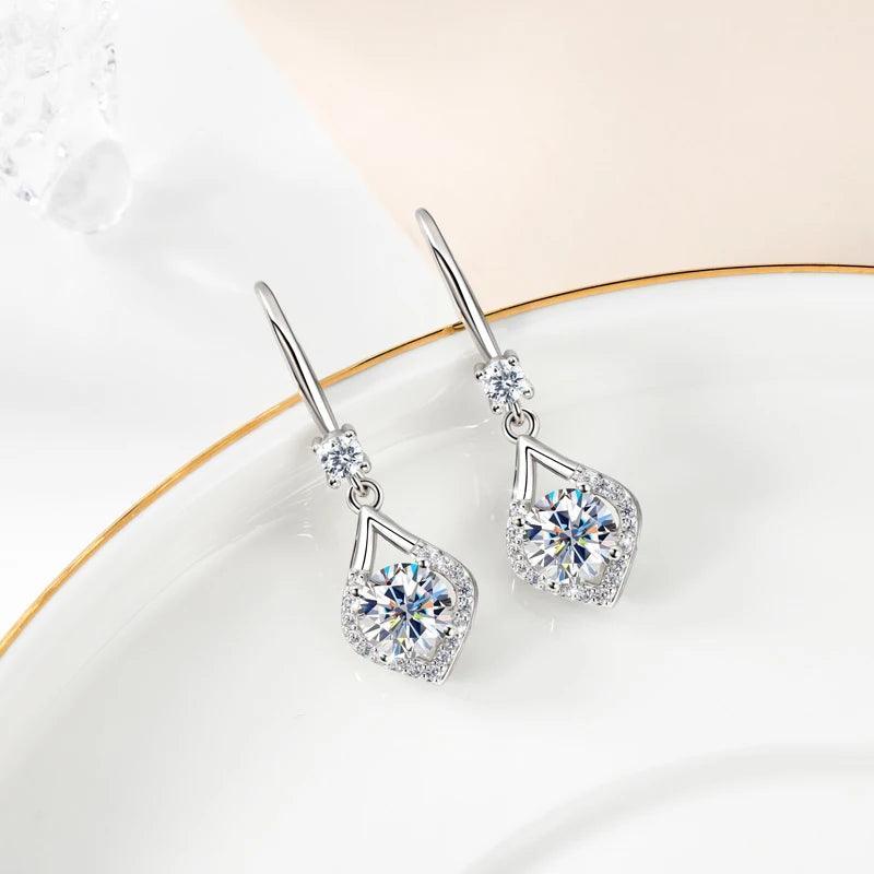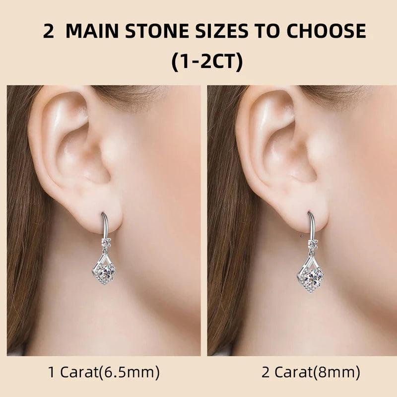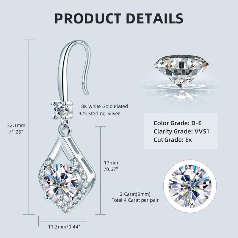 These exquisite earrings feature stunning 2.0 carat VVS1 Moissanite stones, elegantly set in sterling silver 925. The drop hook design adds a touch of sophistication and glamour, making them perfect for special occasions. This fine jewelry piece is sure to make a statement and elevate any outfit with its luxurious sparkle and timeless elegance. Ideal for gifting or treating yourself to a touch of luxury, these earrings are a must-have addition to any jewelry collection.