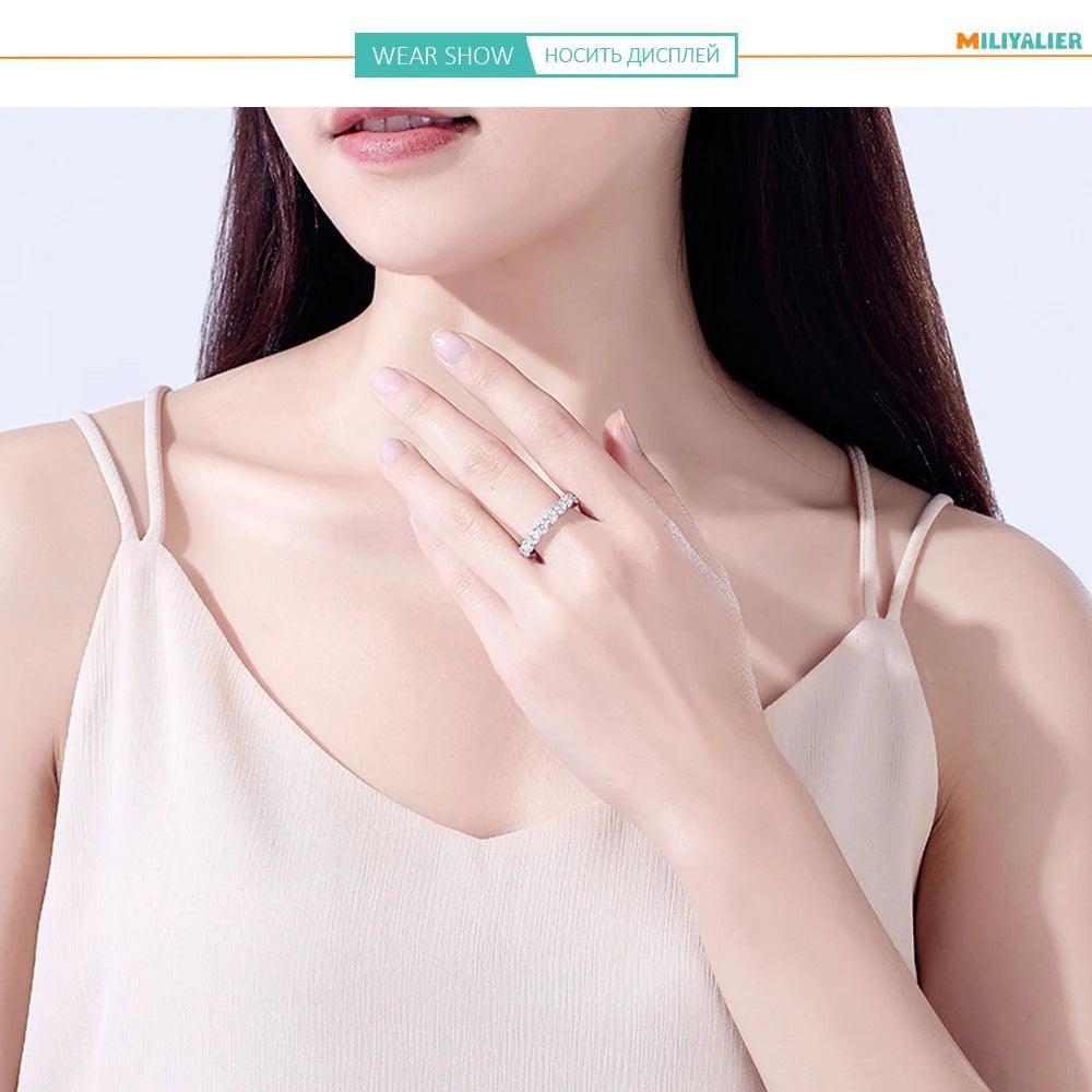 Crafted from 925 sterling silver, this ring combines durability and elegance. Sterling silver is known for its strength and ability to retain its shine over time, making it a practical choice for an everyday piece of jewelry. The design of the ring is both modern and classic, with clean lines that highlight the beauty of the moissanites. Each stone is carefully set to maximize its brilliance, creating a sparkling effect that catches everyone's eye.