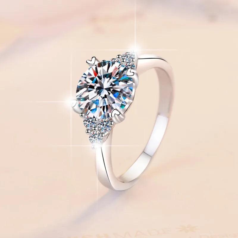The prong setting securely holds the Moissanite, enhancing its brilliance and showcasing the stone's natural beauty.
