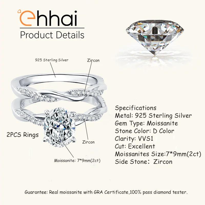 GRA Certified 2CT D Colour VVS1 Oval Moissanite Diamonds Engagement Wedding Ring Set for Women Silver Fine Jewellery