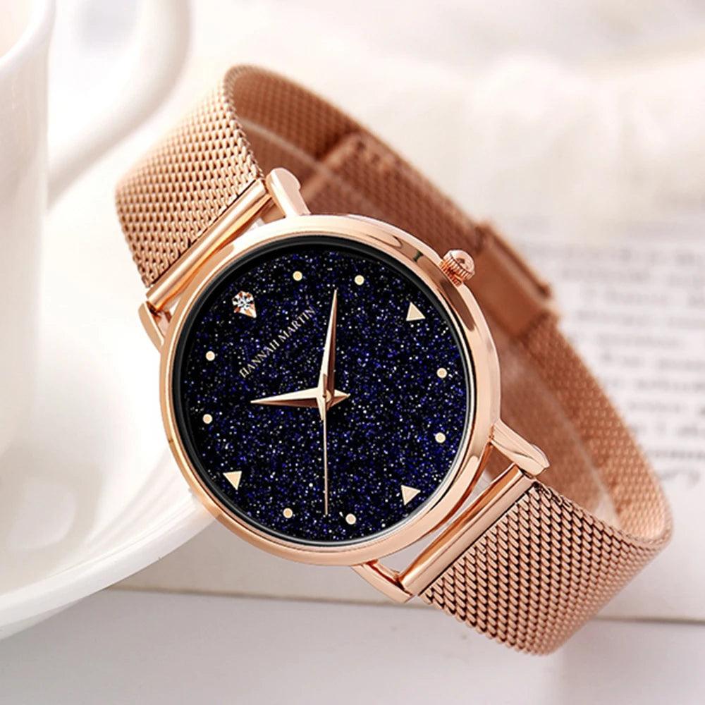 This elegant women's watch, recently launched, combines luxury and sophistication. Featuring a starry dial adorned with sparkling rhinestones, this watch is a true eye-catcher. Its stainless steel bracelet not only ensures exceptional durability but also optimal comfort on the wrist. In addition, its waterproof design makes it a practical accessory for any occasion, whether it's a casual outing or a formal event. This model is the perfect gift for those who appreciate style and elegance, adding a touch of glamour to any outfit.